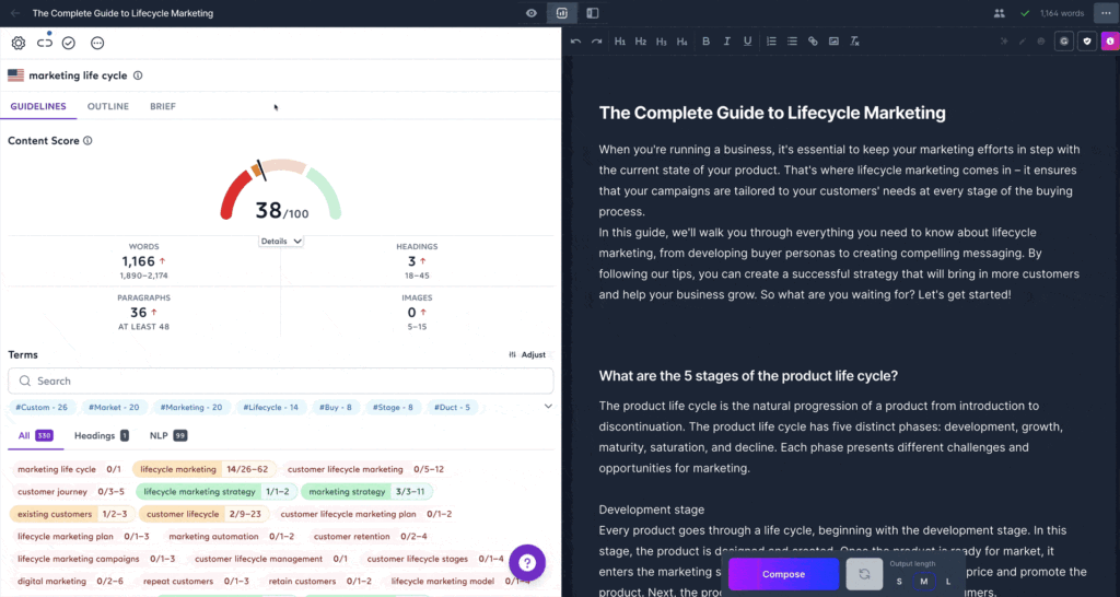 At the heart of SurferSEO lies its Content Editor, a feature I particularly adore. This tool enables a thorough analysis of competitors’ content for specific keywords, providing insights to enhance your own content. It offers a detailed breakdown of competitors’ content, including word count, headings, images, and links. Moreover, it suggests keywords and provides an optimization score, allowing you to tailor your content to match search intent.